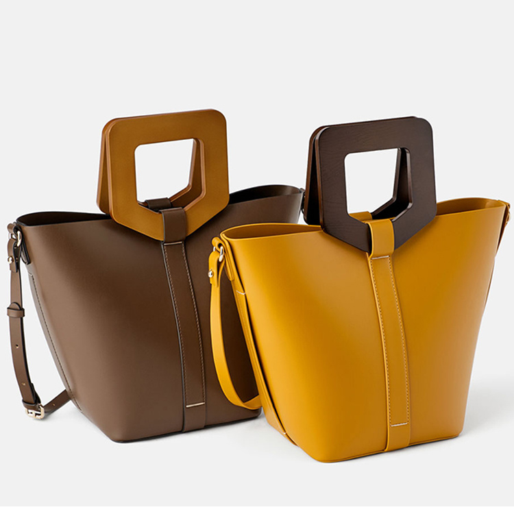 Custom Smooth Leather Wooden Handle Ladies Hand Bag